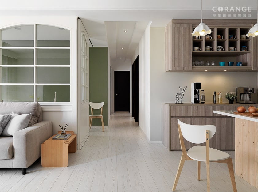 • 儲藏室門片設計溝縫,讓端景牆看起來自然,並懸掛畫作,以弱化門片效果。