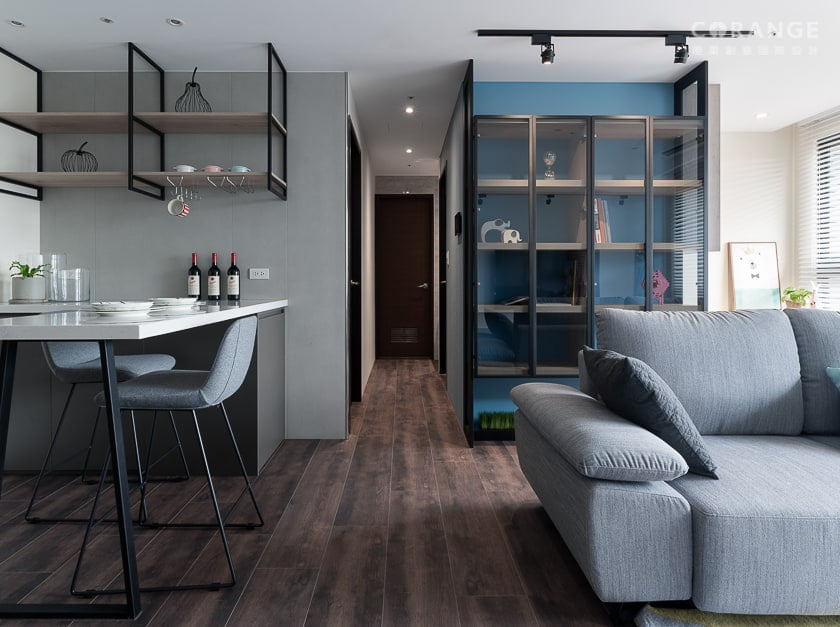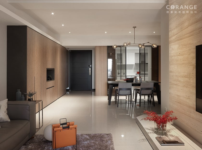 新竹室內設計、老屋翻新案例,位於新竹現代大氣風格設計,媲美飯店精品宅,4房2廳3衛2陽台,使用KD木皮板、系統板、鍍鈦金屬鐵件、主臥更衣室彎曲玻璃、隔柵門片、大樑修飾,三代同堂設計。橙果創意協助您控制室內設計預算。